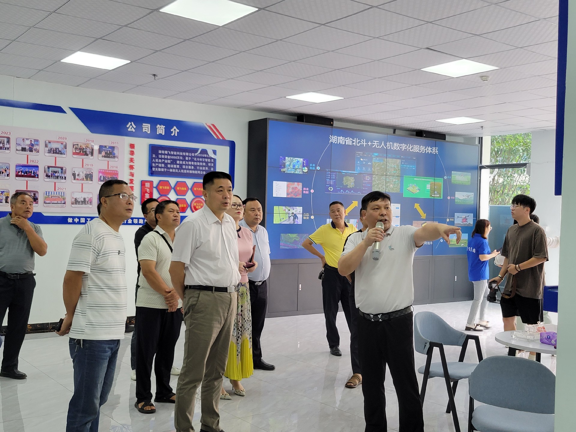 在精飛智能展廳,精飛集團董事長龍永堅向調研組一行匯報了企業(yè)生產(chǎn)經(jīng)營、技術研發(fā)、產(chǎn)品銷售等情況,其中重點講解了無人機數(shù)字農(nóng)業(yè)服務應用示范建設項目及自主開發(fā)的全國首個“北斗+無人機數(shù)字農(nóng)業(yè)綜合應用與公共服務”平臺運營情況。