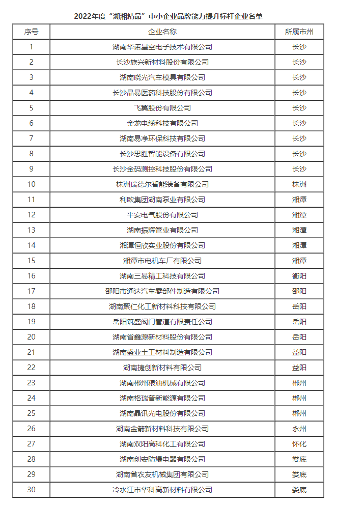 根據(jù)《“湖湘精品”中小企業(yè)品牌能力提升三年行動(dòng)計(jì)劃(2021-2023年)》和《關(guān)于征集2022年度“湖湘精品”中小企業(yè)品牌能力提升標(biāo)桿企業(yè)的通知》要求,經(jīng)試點(diǎn)企業(yè)申報(bào)、市州工信局推薦、專(zhuān)家評(píng)審及公示等程序,省工信廳遴選出30家企業(yè)為2022年度“湖湘精品”中小企業(yè)品牌能力提升標(biāo)桿企業(yè),現(xiàn)予公布。