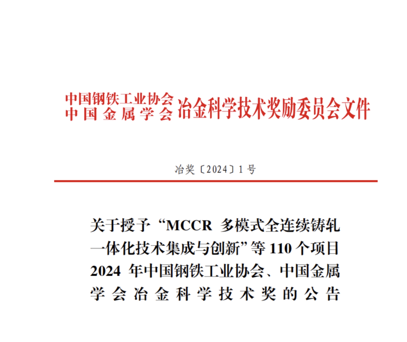 近日,中國鋼鐵工業(yè)協(xié)會(huì)、中國金屬學(xué)會(huì)冶金科學(xué)技術(shù)獎(jiǎng)獎(jiǎng)勵(lì)委員會(huì)發(fā)布2024年冶金科學(xué)技術(shù)獎(jiǎng)公告,決定對(duì)110個(gè)項(xiàng)目授予2024 年冶金科學(xué)技術(shù)獎(jiǎng)。