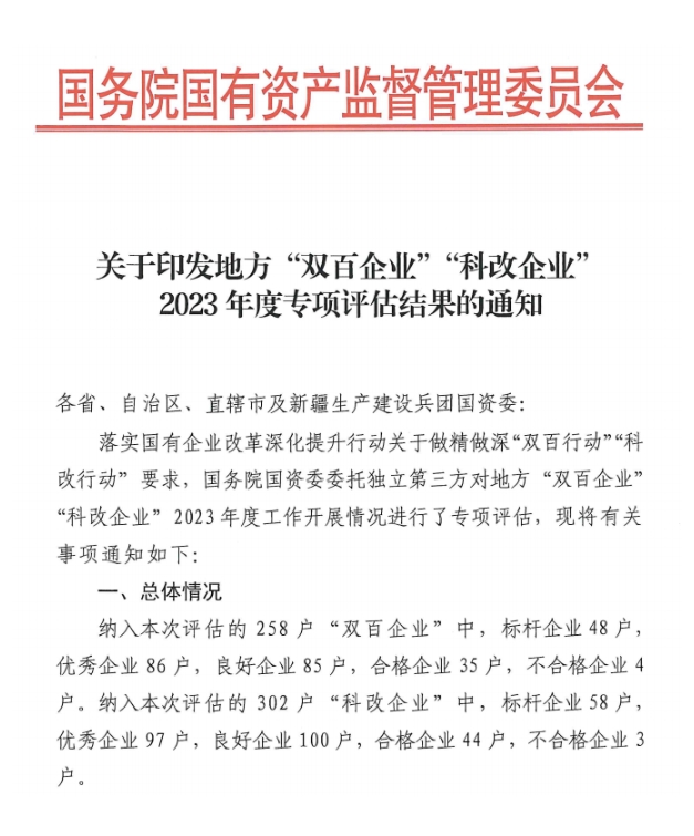 據(jù)了解,“科改企業(yè)”專項評估每年進行一次,旨在落實國有企業(yè)改革深化提升行動關(guān)于做精做深“科改行動”要求。本次國務(wù)院國資委委托獨立第三方對地方“科改企業(yè)”2023年度工作開展情況進行了專項評估,考核結(jié)果按照得分高低分為標(biāo)桿、優(yōu)秀、良好、合格、不合格五個等級,考核內(nèi)容涉及企業(yè)科技創(chuàng)新、體制機制、綜合成效等方面共計47項指標(biāo),全面權(quán)威地反應(yīng)了企業(yè)在加快科技新成果轉(zhuǎn)化、提升自主創(chuàng)新能力等方面的舉措和成果。